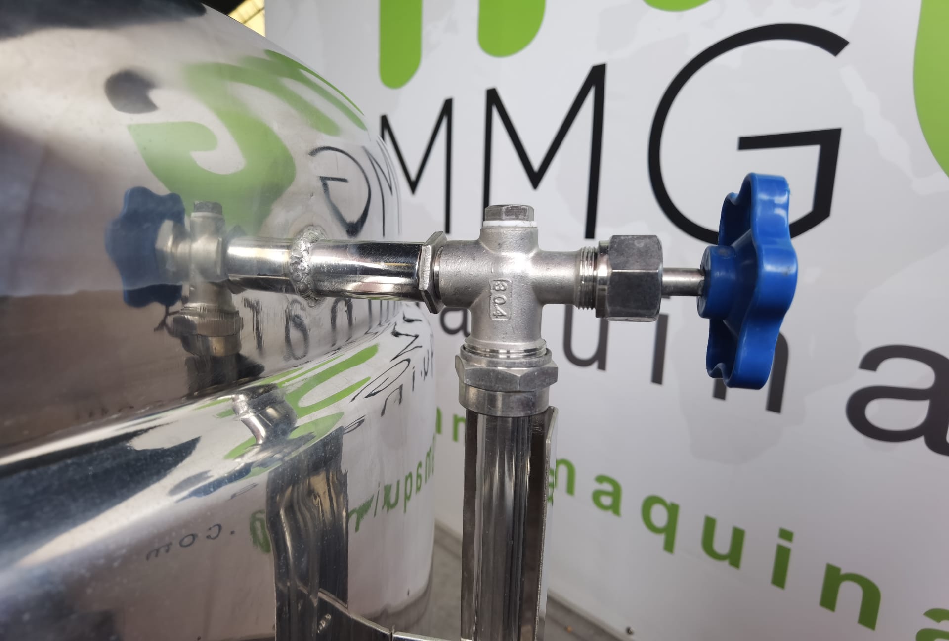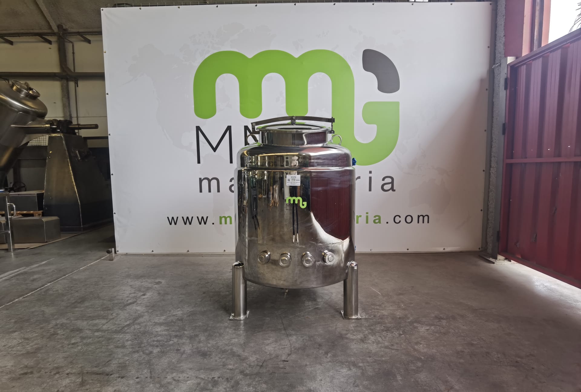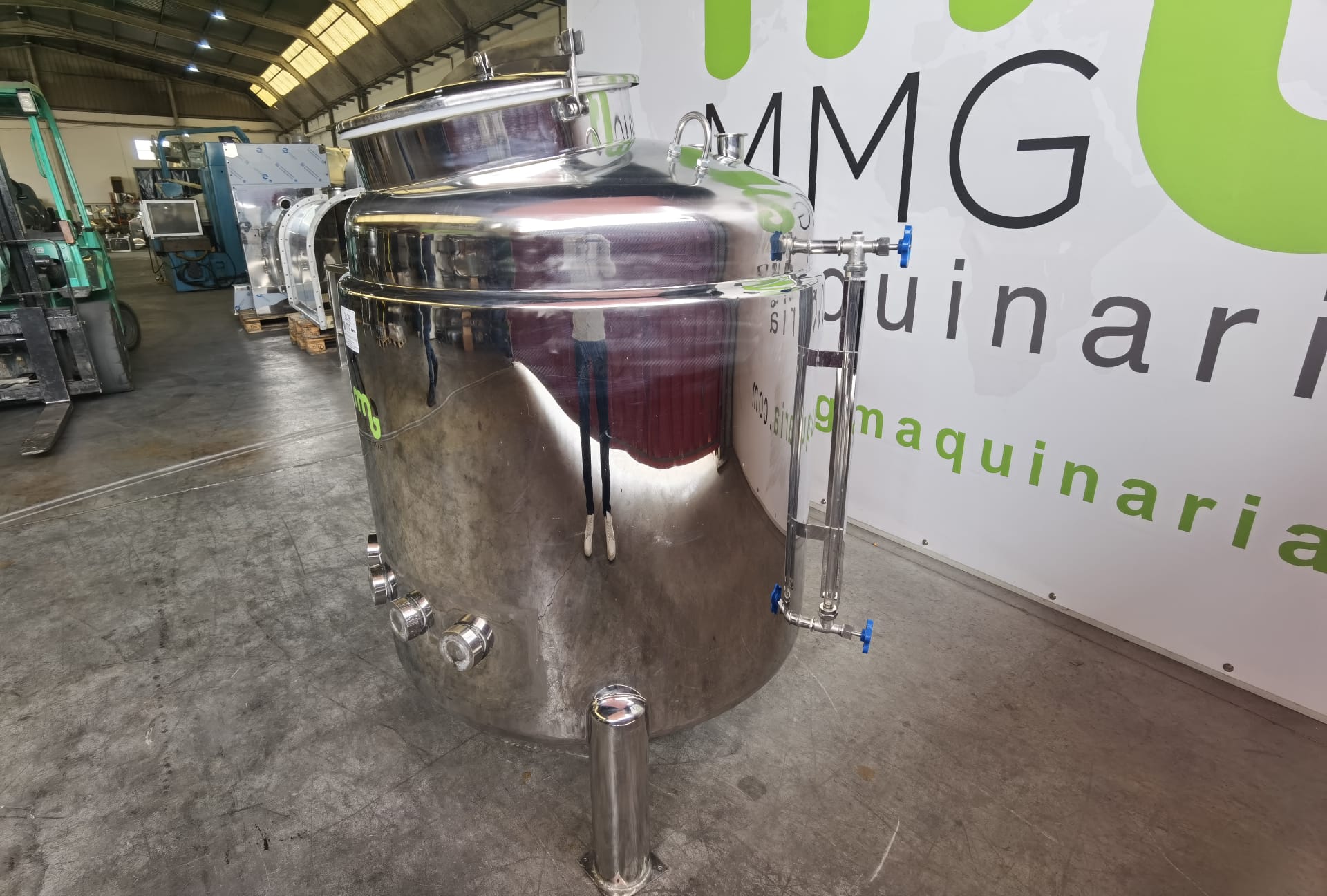 Depósito de doble fondo para recircular agua de 600 litros de capacidad en acero inoxidable ideal para productos líquidos que necesiten ser sometidos a cambios de temperatura, consta de un medidor de volumen y un fondo semicónico que favorece al vaciado total.