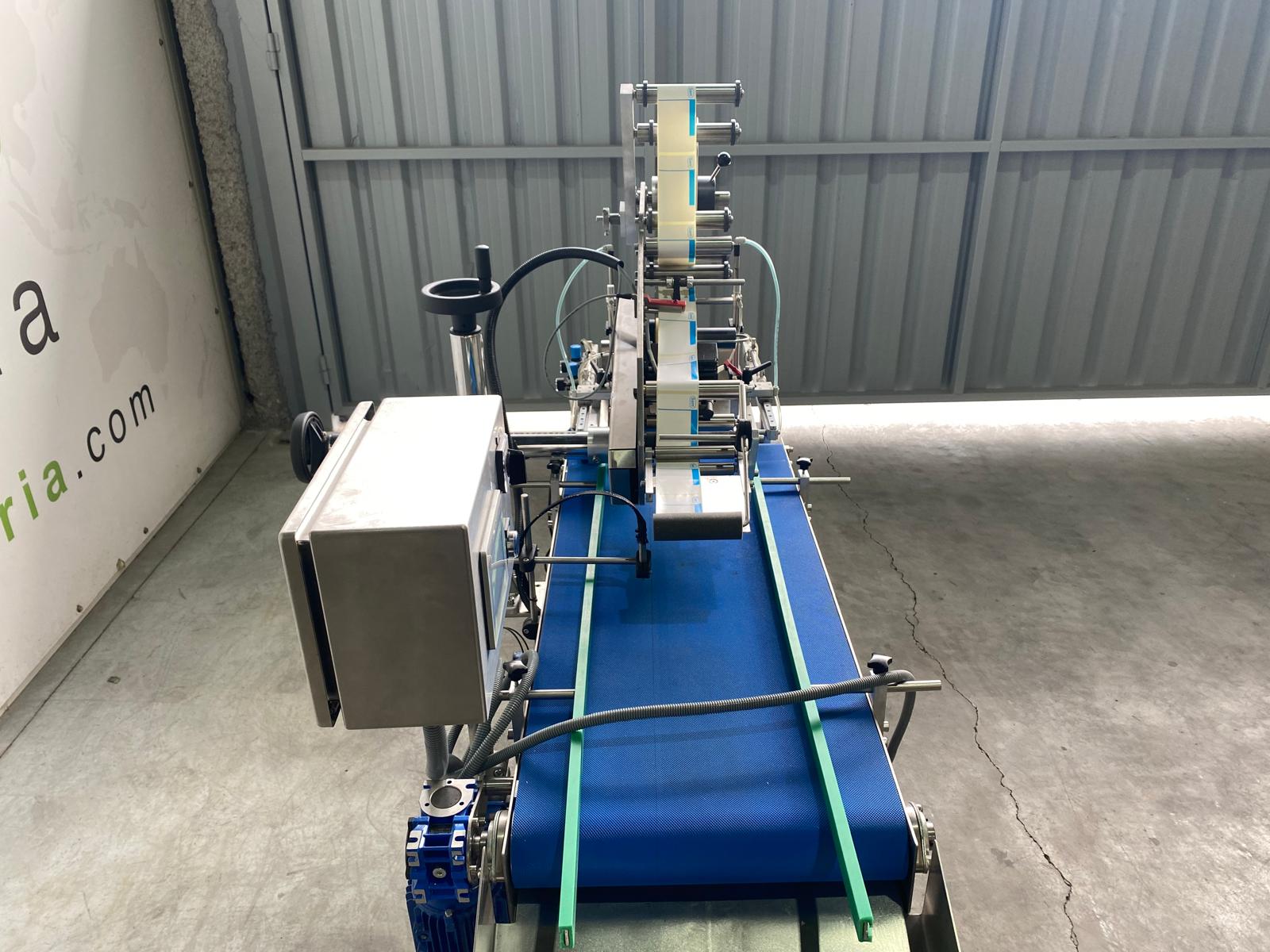Esta etiquetadora ha sido diseñada para aplicar etiquetas en superficies planas como puede ser la de bolsas o cartones. Cuenta con una plataforma de carga de bolsas y bandas de alta fricción.