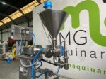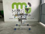 La máquina es móvil, montada sobre cuatro ruedas giratorias con frenos para asegurar la unidad durante la operación. Toda la parte de la máquina que entra en contacto con el producto está hecha de acero inoxidable, lo que facilita la limpieza y el mantenimiento.